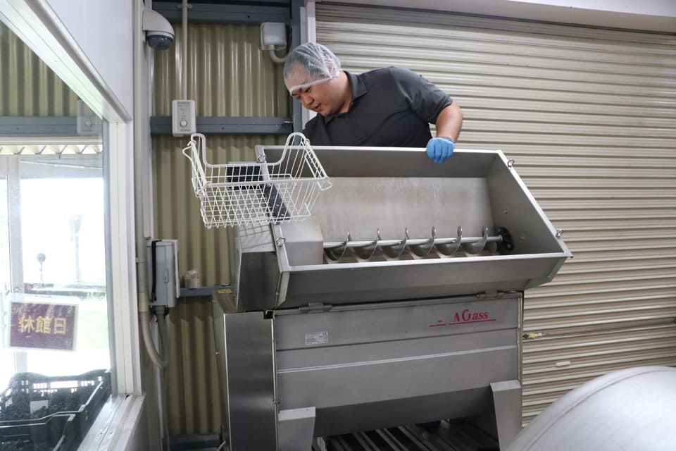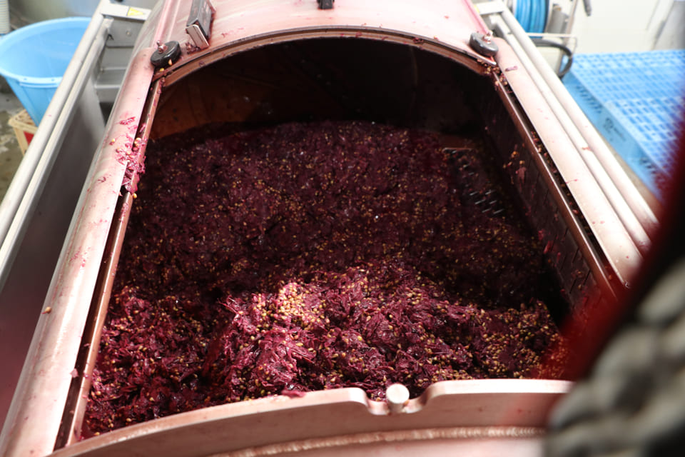 そしていよいよ、収穫されたぶどうが最初に向かうのが「除梗・破砕」の工程です。収穫した房から果梗(かこう:粒がつく軸の部分)を取り除き、果粒だけに分けます。専用の機械のドラムが回転することで、粒は下に落ち、軸は分別される仕組みです。その後、粒はやさしく破砕され、果汁をタンクに送る準備が整います。果梗を取り除くことで雑味を防ぎ、ぶどう本来のフレッシュな香りと味わいを引き出すことができます。