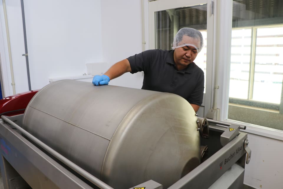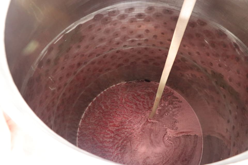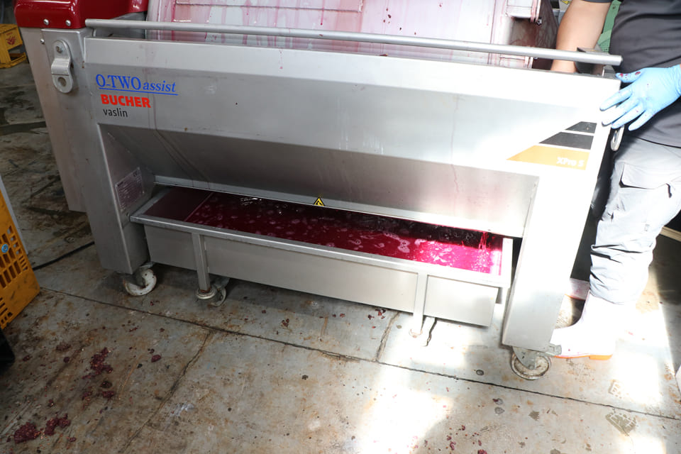 ワイン造りにおいて、澱(おり)の有効活用は非常に重要な工程のひとつです。写真では、ワインタンクから回収された澱に圧をかけ、凝縮されたエッセンスを取り出す作業が行われています。この工程は、搾汁後にタンク底に溜まる澱を廃棄するのではなく、最後の一滴まで葡萄の旨味を抽出するという、まさに「無駄にしない」精神に基づいたものです。