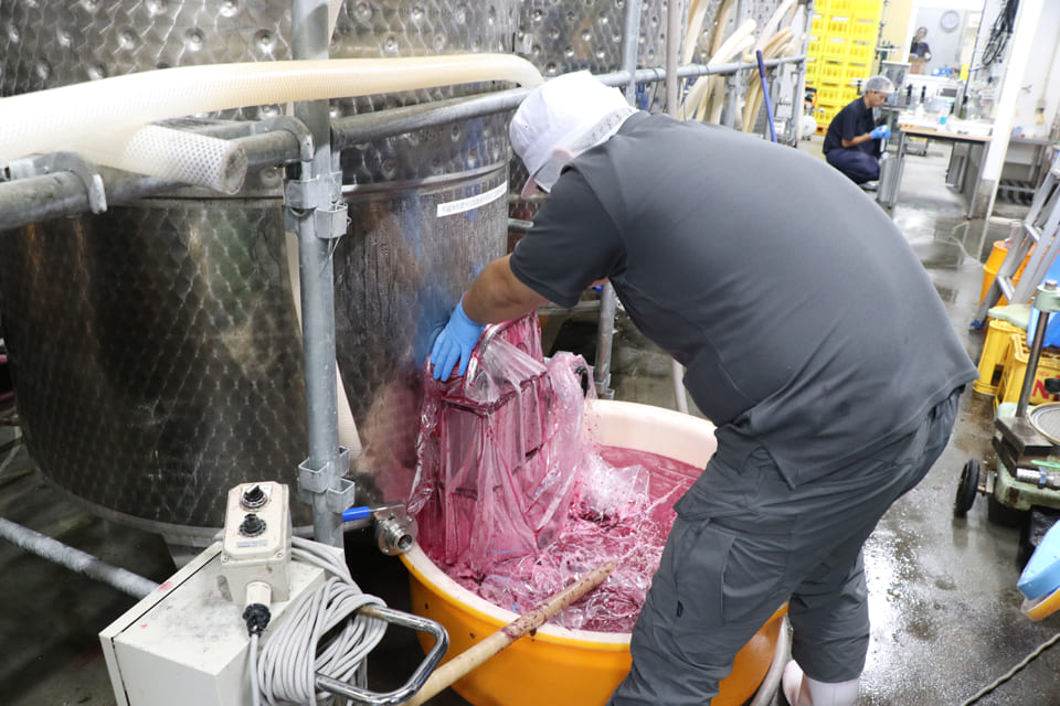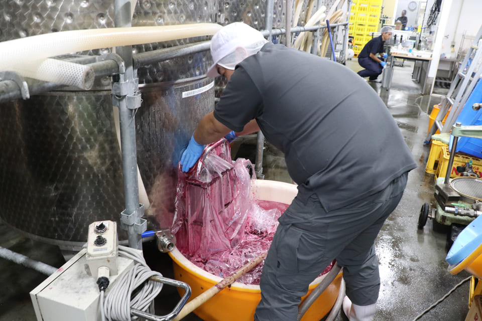 小坂七滝ワイナリーでは、発酵を終えた醪(もろみ)をタンクから取り出し、圧搾工程へと移ります。タンクの底には果皮・種子・果肉が沈殿し、発酵によって生成されたアルコールや色素、タンニンが抽出されています。この段階では液体と固形物が混ざり合っており、まずは重力で自然に流れ出る「フリーランワイン」を回収します。これは雑味が少なく、香りが華やかでエレガントな特性を持ち、最終的なワインの「芯」となる部分です。